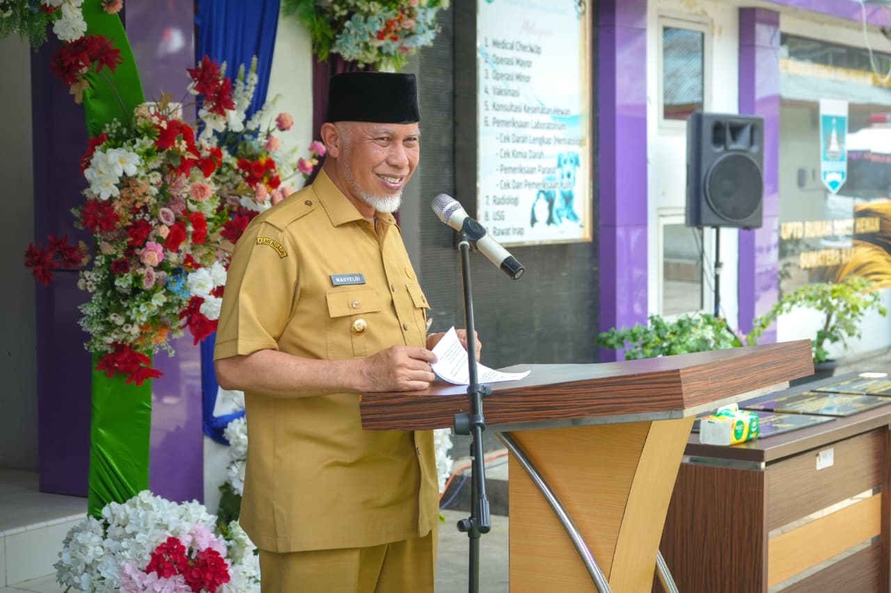 PADANG — Gubernur Sumatera Barat (Sumbar), Mahyeldi Ansharullah meresmikan penerapan Badan Layanan Umum Daerah (BLUD) pada tiga Unit Pelaksana Teknis Daerah (UPTD) sektor peternakan di lingkungan Pemerintah Provinsi Sumbar, yakni UPTD Rumah Sakit Hewan Sumbar, UPTD Ternak Unggas, dan UPTD Balai Pembibitan Ternak dan Semen Beku (BPTSB) Tuah Sakato, Senin (19/1/2026).