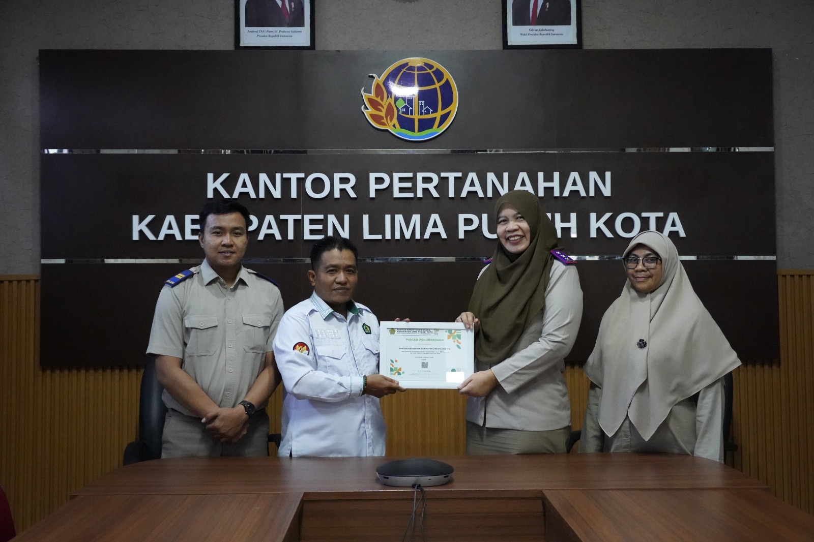 Lima Puluh Kota, 19 Januari 2026 — Kantor Pertanahan Kabupaten Lima Puluh Kota meraih piagam penghargaan dari Kementerian Agama Kabupaten Lima Puluh Kota atas sinergi dan kerja sama dalam pelaksanaan sertipikasi tanah Barang Milik Negara (BMN) Kementerian Agama dan tanah wakaf di Kabupaten Lima Puluh Kota. Penghargaan tersebut diterima langsung oleh Kepala Kantor Pertanahan Kabupaten Lima Puluh Kota, Ibu Lucy Novianti, S.SiT., M.H.